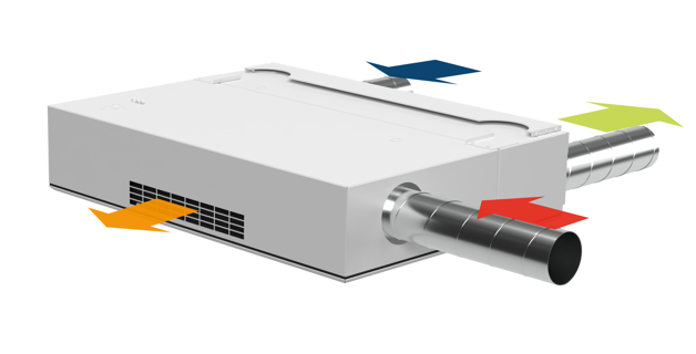 Das Lüftungsgerät kann komplett sichtbar installiert oder teilweise in die Decke integriert werden, so dass nur der untere Teil sichtbar ist. De Absaugung kann ebenfalls über Rohre geleitet werden. So ist es z. B. möglich, das Lüftungsgerät über einer Decke zur diffusen Deckenlüftung einzubauen oder die Absaugung aus einem angrenzenden Raum anzuschließen.